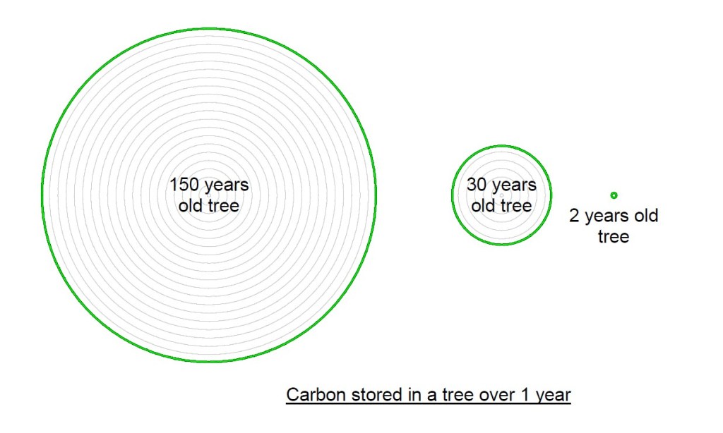 You can guess the age of a tree stump by counting the rings. Every year, a new ring is created on the outside, just under the bark. When you cut a 30-year-old tree and replace it with a new 2-year-old sapling, the amount of Carbon captured in the outer ring of the new tree will be insignificant. If instead of cutting the tree you were letting it grow, the outer ring circumference would increase every year, capturing more and more carbon.